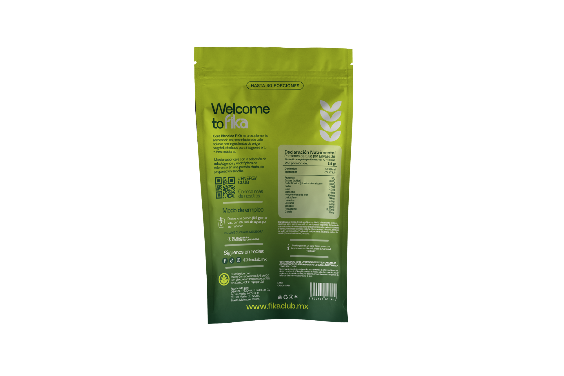 View compareFika es un polvo soluble a base de café, enriquecido con adaptógenos, aminoácidos y extractos naturales. Su fórmula incluye melena de león, L-triptófano, cúrcuma, L-teanina, resveratrol, jengibre, canela y bisglicinato de magnesio. Está diseñado para disolverse fácilmente en agua caliente y consumirse como bebida funcional.
